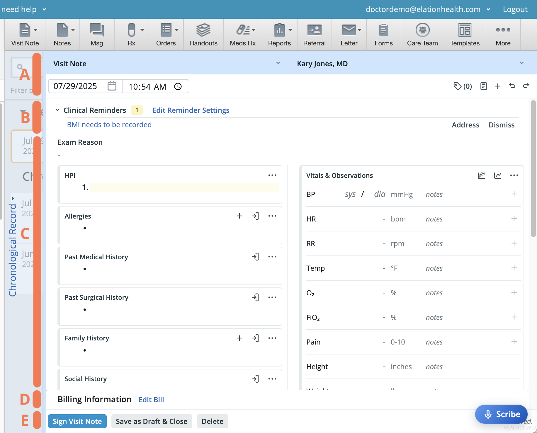 The body is where users can input content for the visit note - from the exam reason (i.e. chief complaint) through follow-up instructions. At a glance, the body is nearly identical to the body of the original 2 column note. In fact, the Elation Note by default shows every section from the Complete H&P Note (2 col-A/P) with the exception of the Data section. However, each of these sections in the Elation Note is now a dynamic block, also known as a standard block.Billing Information & Confidential Indicator (D)