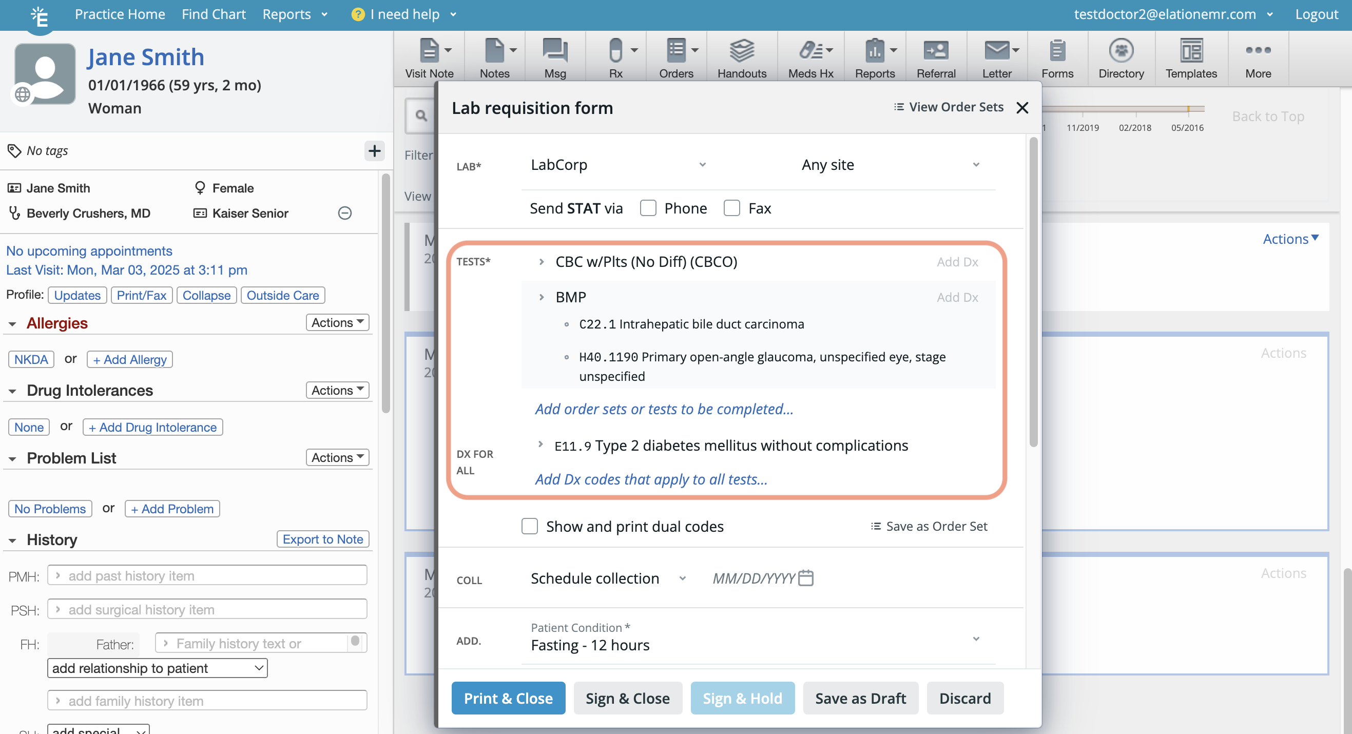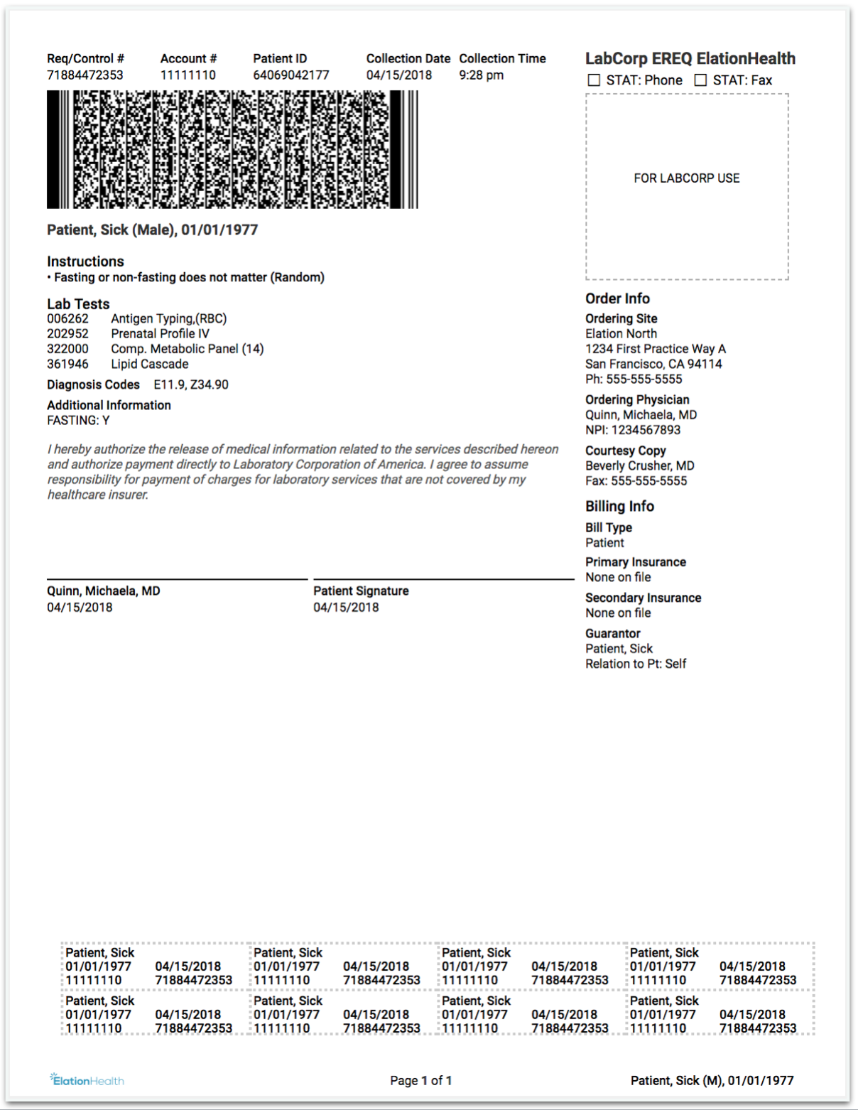 Clicking eOrder or eOrder & Print will immediately send lab orders electronically to the lab vendor. Afterwards, the signed order will be saved in the patient’s chart.- The following information will be added to the signed lab order: