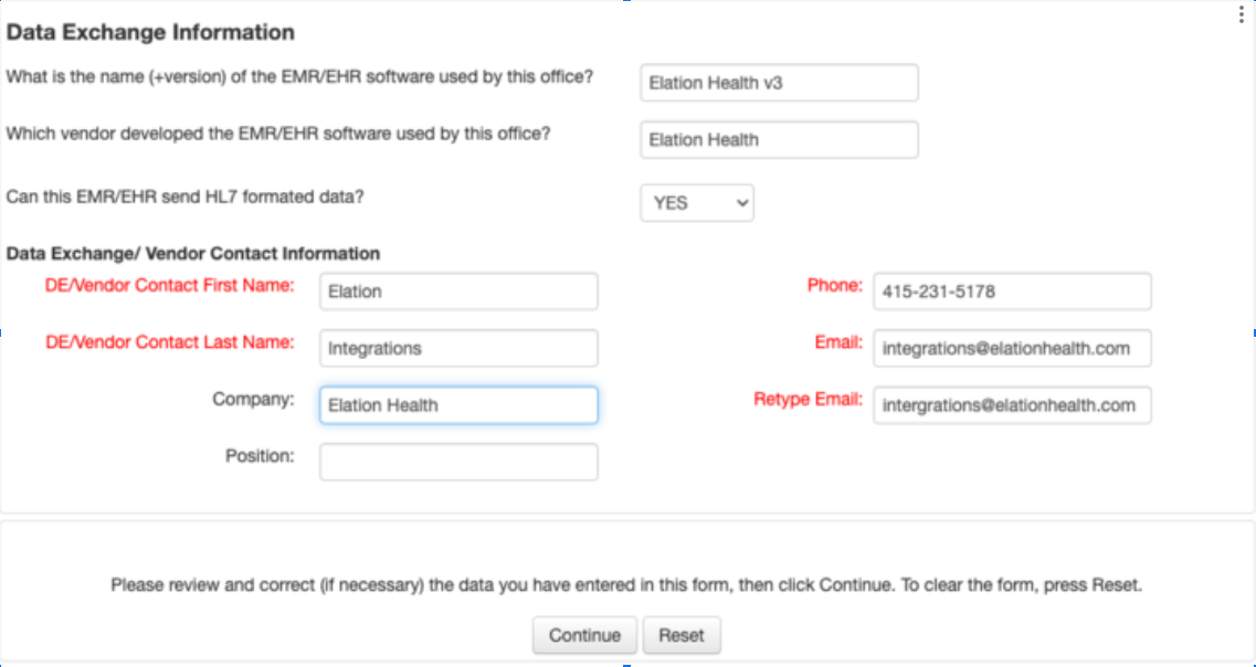 - You will then be prompted to enter the “Sending Facility ID of your Data Submitter.” Elation’s Sending Facility ID is SF-001728.
