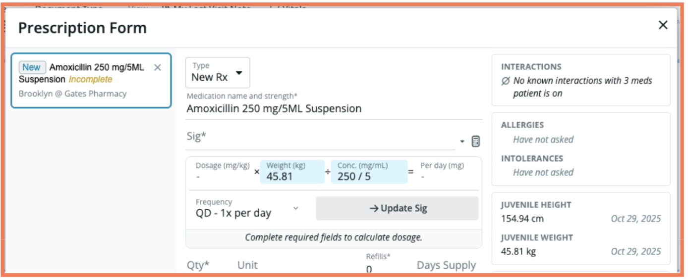 Our new in-form pediatric dosing calculator streamlines the weight-based dosing process by surfacing the patient’s weight, computing the correct SIG and quantity, and pre-populating concentrations where available. Learn more in this Help Center Article.