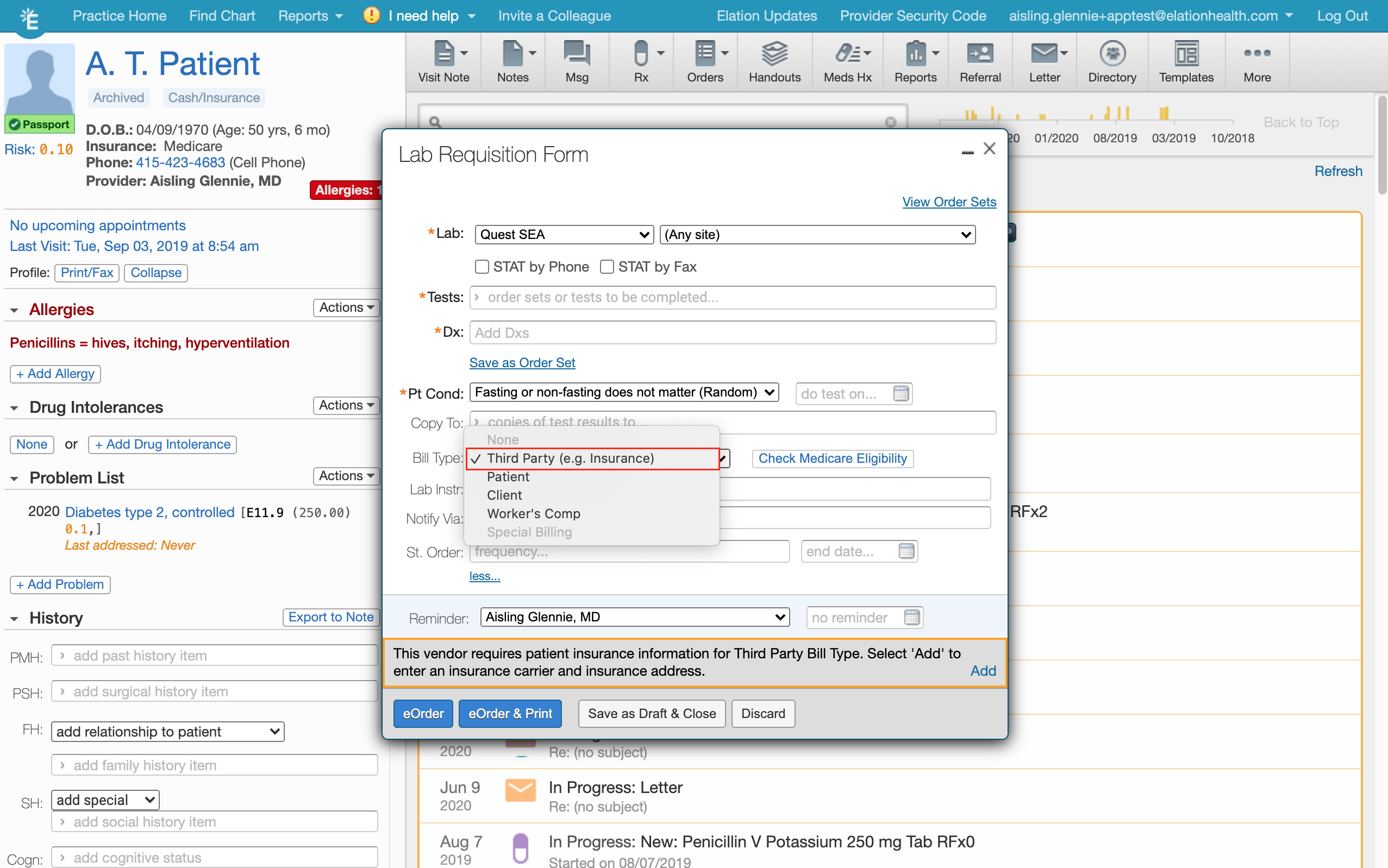 The directory of all tests available for a Quest region (Compendium), is supplied and maintained by Quest. Elation EHR updates our Quest compendium on a monthly basis. Elation will automatically assign your practice the Quest compendium specific to your region. We recommend trying to search for the test using different terms (ex. the Complete Metabolic Panel is known as “Comprehensive Metabolic Panel” for Quest) If you have a question about a specific test code, please contact your Quest representative for assistance. Custom Quest codes are not supported at this time.What do the different Bill Types mean?