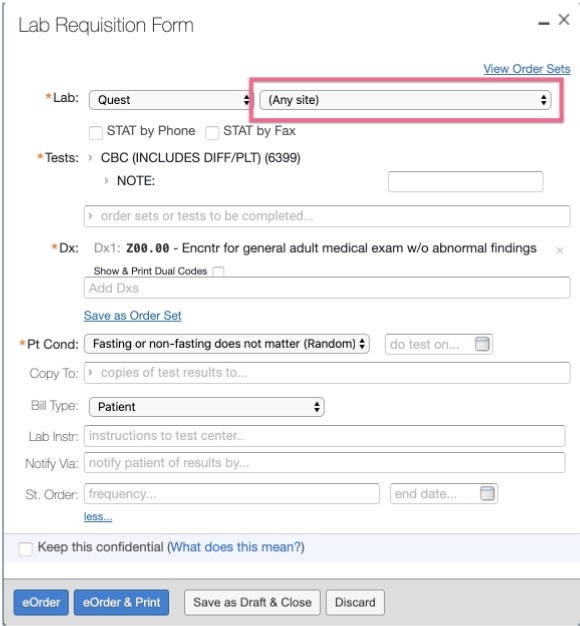 Creating a Quest electronic laboratory order and requisition