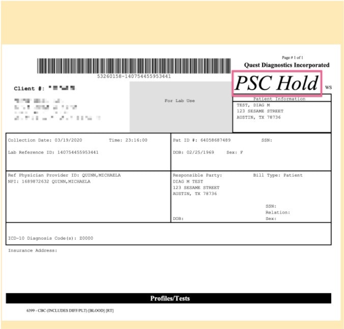 - The PSC Hold status will be included in the electronic transmission to Quest and on the requisition form