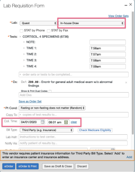 Elation supports Quest electronic ordering for In-House Draws (point of care specimen collection) at your practice. To create an eOrder for In-House draws:- After selecting the Lab Vendor, select “In-House Draw” from the drop down menu to the right of “Lab”.
