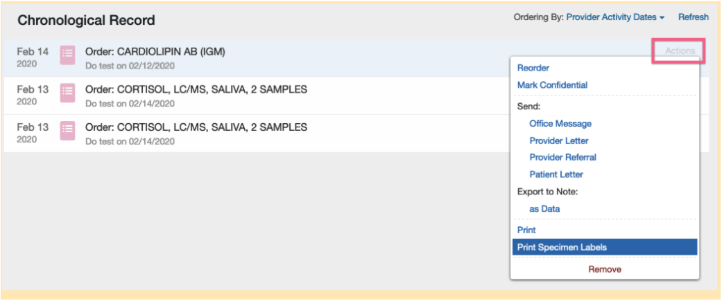 The requisition form can be printed while eOrdering (“eOrder & Print”), directly from the chronological timeline, or from the Lab Reports view.- To print from the chronological timeline, hover over the lab order, click the ‘Actions’ tab on the top right corner, and then select “Print Specimen Labels”.
