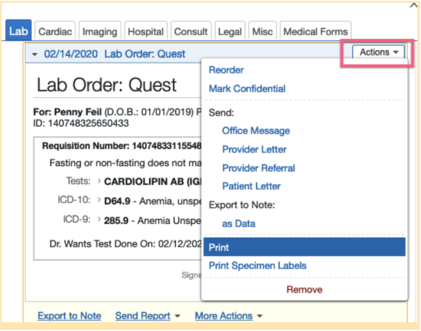 - To print from the Reports tab, select the desired lab order, then click “Actions” to print the requisition form.