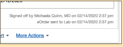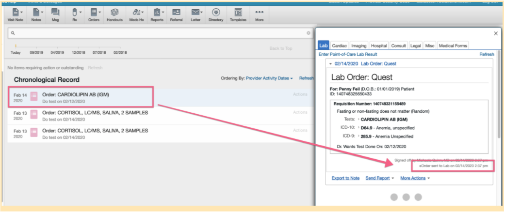 Orders that have been created and sent to Quest can be found in the chronological timeline and are organized by the date the requisition was created. If there was a specified date on which provider wanted the patient to do the test, the “do test on” date will also display in the timeline in grey. To view which provider signed off on the order, click into the lab order from the chronological record to view the confirmation and the “eOrder sent to Lab” timestamp.