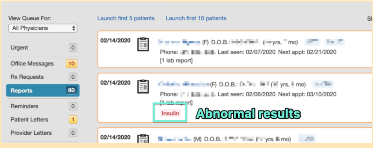 Lab results will appear in the ordering provider’s Reports queue. Any abnormal results will be flagged in the Report queue with red text.- To view the report, click the patient’s name to open the chart.