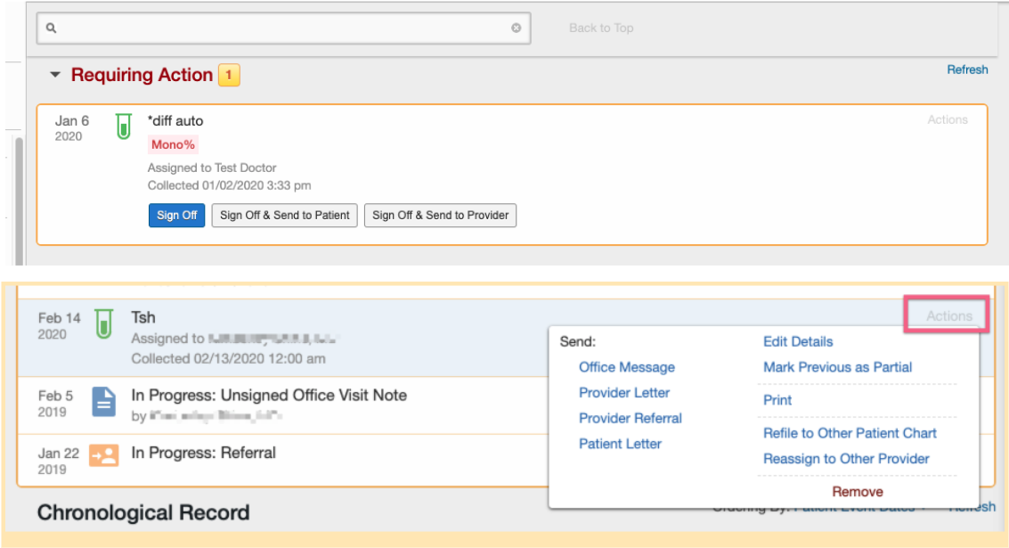 When a new result is received, the result will appear in the Requiring Action queue of the patient’s chart. The provider can choose to “Sign off”, “Sign off & send to patient”, or “Sign off & send to provider” the result. Once the report is signed off, the report will be filed in the chronological record. Hovering over the lab result will allow the user to click “Actions” to take any next steps. The actions that can be taken from a lab result are:- Sending an internal office message about the patient’s results