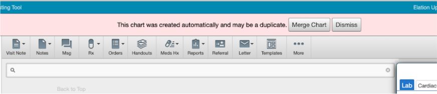 Elation matches incoming laboratory results to existing charts by patient name, date of birth, and gender. If an incoming result does not match an existing chart, a new chart will be created with a warning banner at the top. The banner will prompt you to “Merge Chart” or “Dismiss”. If “Merge Chart” is selected, you will be prompted to merge the chart and Quest result into an existing chart. Once this merge is completed, Elation will “remember” the chart merge for future results for this patient.