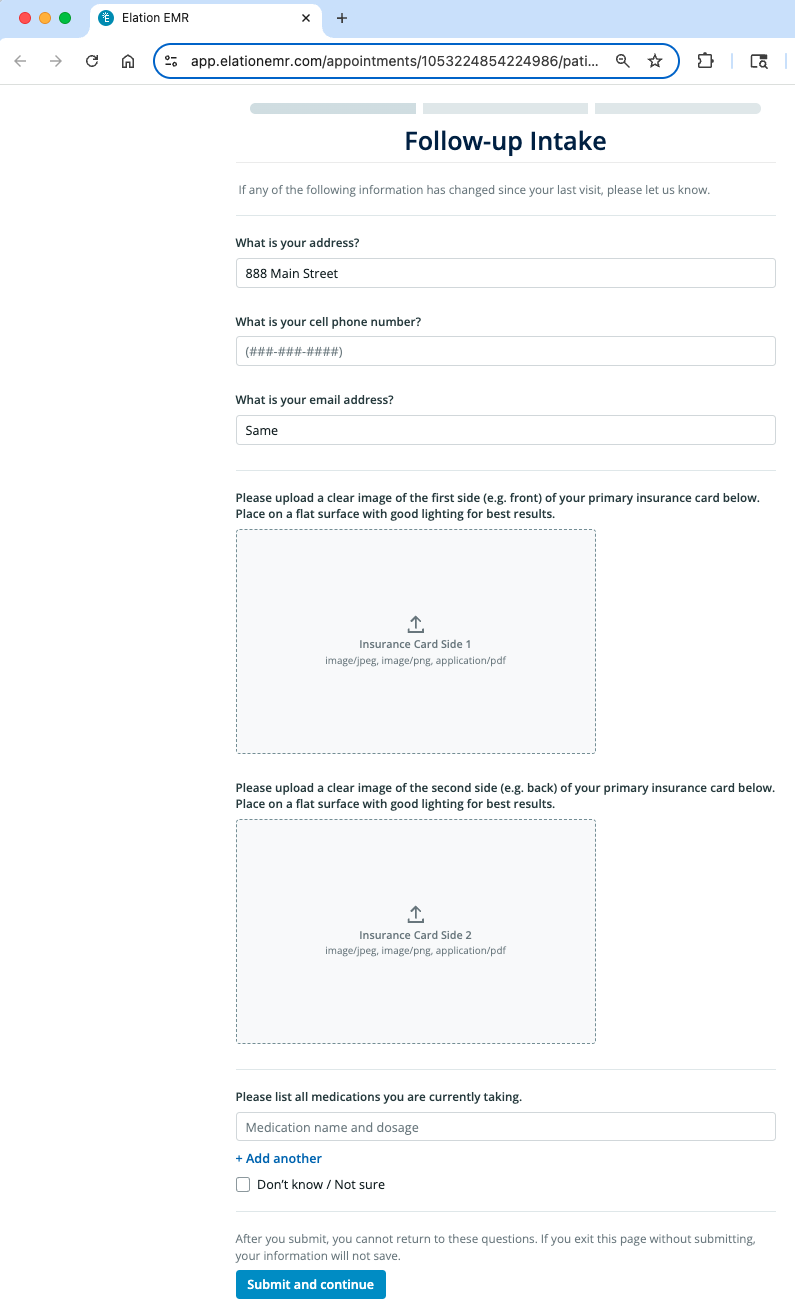 When a patient opens their electronic forms, the progress bar at the top will show the total number of forms included. As each form is completed, the corresponding bar will turn green to indicate progress. Patients can complete each form at their convenience, but each form must be finished in a single session. Responses cannot be saved and resumed later, so patients must click Submit and continue before exiting the form. For questions that allow multiple responses, patients can click + Add Another to include additional entries.Uploading insurance card images