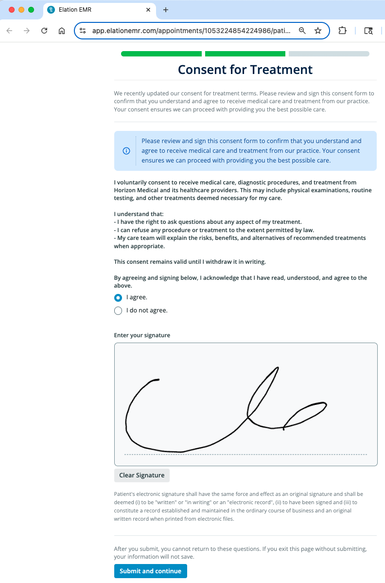 When patients receive a form that requires an electronic signature, they’ll be asked to review the information, indicate their agreement or disagreement, and sign using their cursor. Both a response and a signature are required to submit the form. If they need to make changes, patients can clickClear Signature to redraw their signature before submitting.Sample Forms