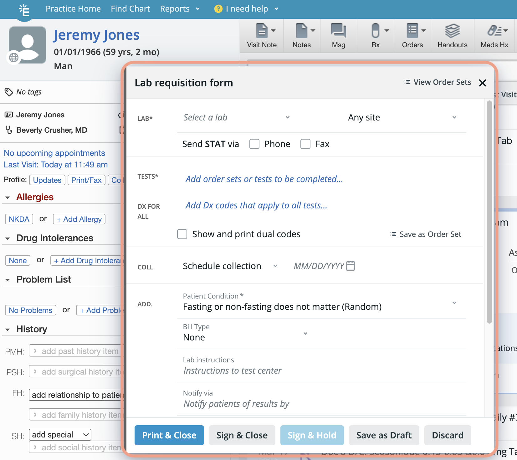 Yes! Staff Level Users can draft lab orders for any patient. Once they are done drafting an order, Staff Level Users can click Save as Draft & Close to keep the lab order in the Requiring Action section of the patient’s chart for providers to complete and sign off. When Staff Level Users draft lab orders, the orders are always assigned to the Provider Assigned in Practice that’s designated in the patient’s demographics. If you would like to allow staff members to sign lab orders on your behalf, you can assign them as a delegate. Click here to learn more about staff delegates.Does Elation have any integrations with lab centers?