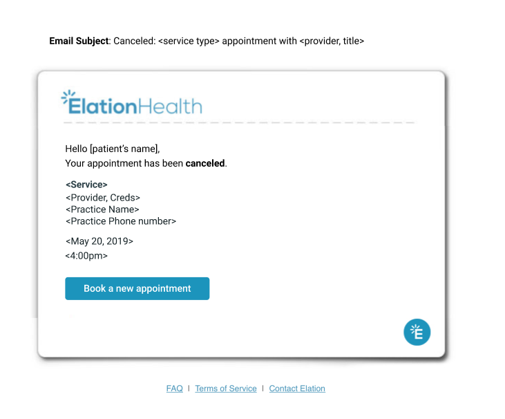 Elation’s automated appointment reminders help ensure that your patients have the information they need to attend their visit and will decrease the number of no-shows on your schedule. All of the information and actions needed to follow up on a scheduled appointment will be immediately available in each appointment reminder.- For text and email appointment reminders, patients will be able to confirm and, if enabled, cancel their appointments directly through the reminder to give your practice more insight into the accuracy of each provider’s Calendar