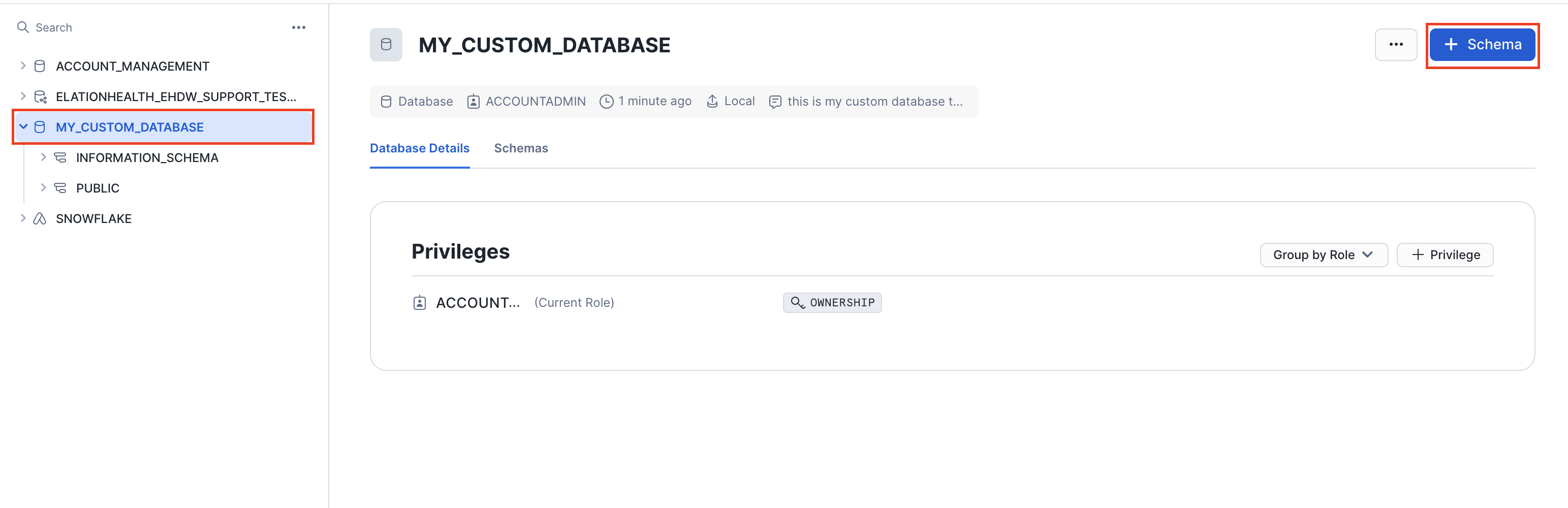 - Click on the newly created Database then click on the blue Schema button on the top right hand side of the page.