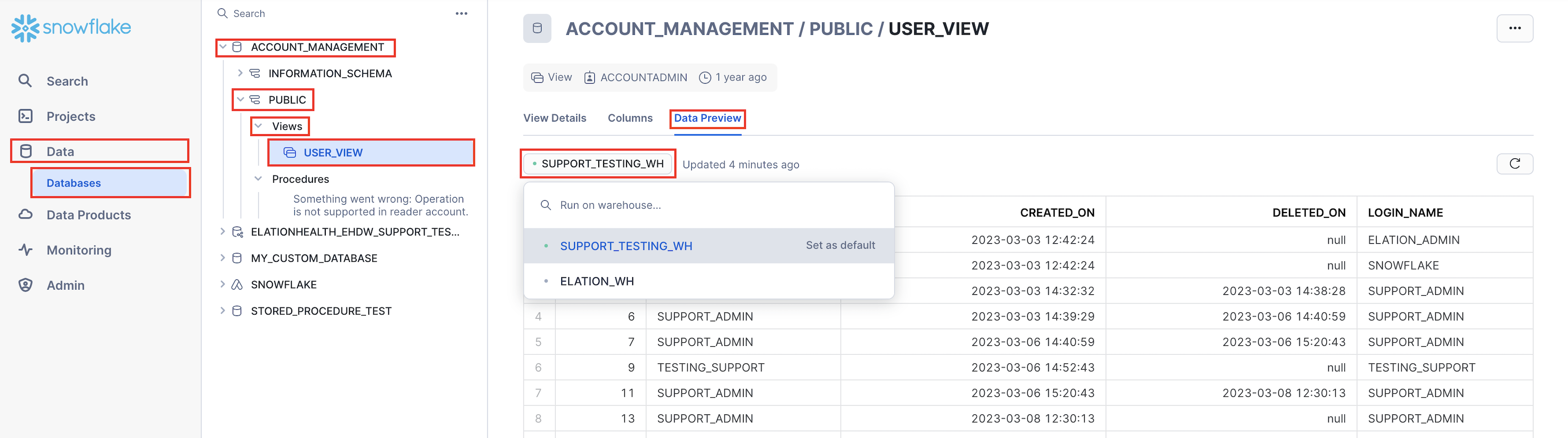 You can view a list of users and their status by either: Accessing USER_VIEW Step 1: On the left hand navigation bar clicking on Data > Databases Step 2: Clicking on ACCOUNT_MANAGEMENT > Public Step 3: Then Click on USER_VIEW and picking your warehouse under Data Preview
