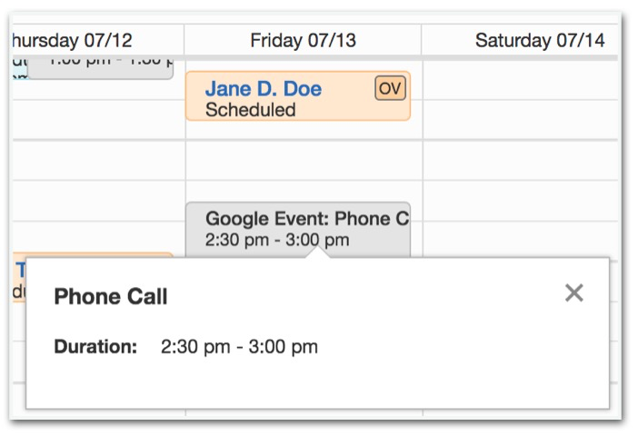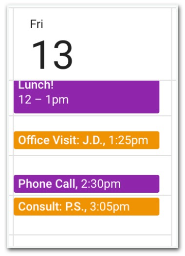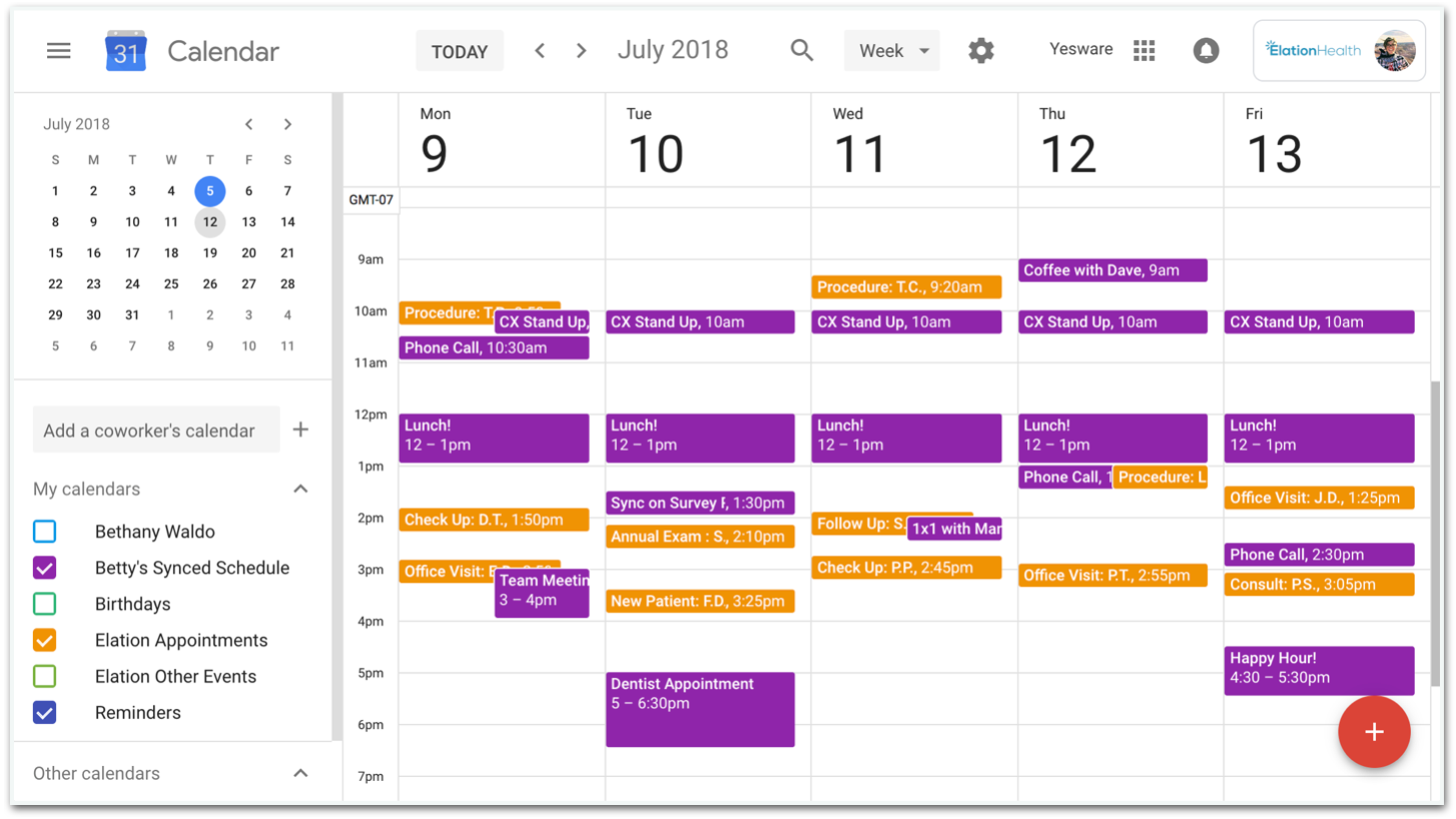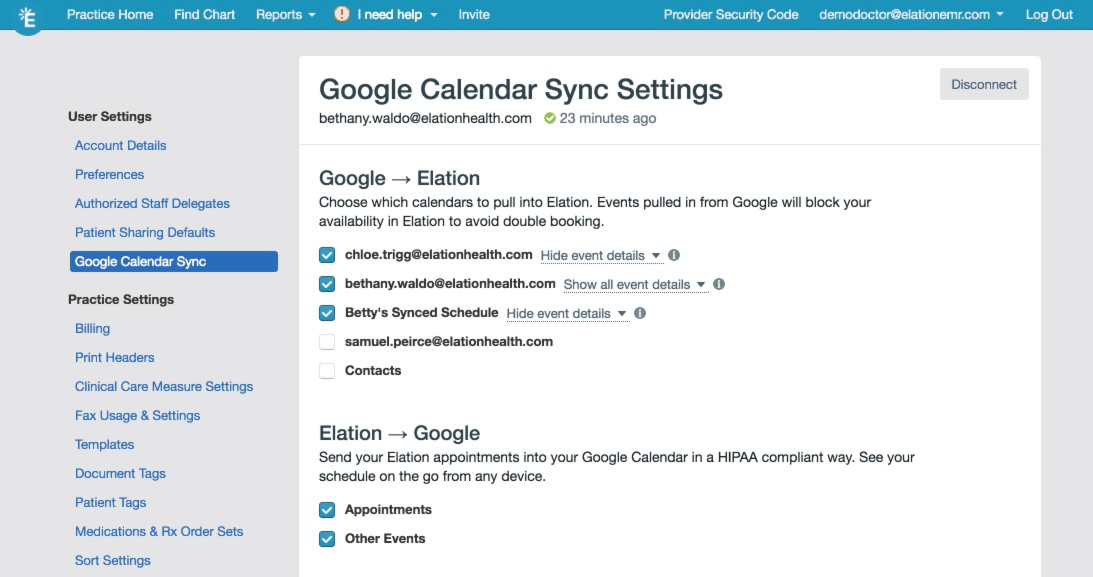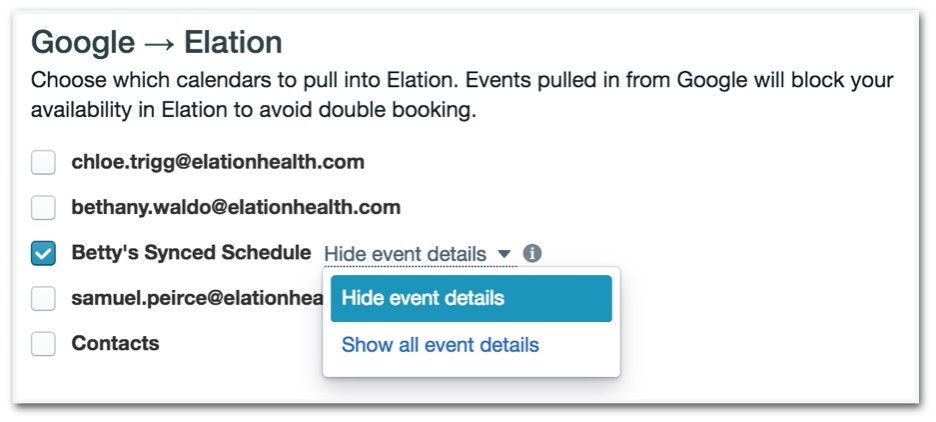 Once set up, all patient appointments will show up on your Google Calendar in a HIPAA compliant way, while personal events populate your Elation schedule at your desired level of privacy.Elation → Google