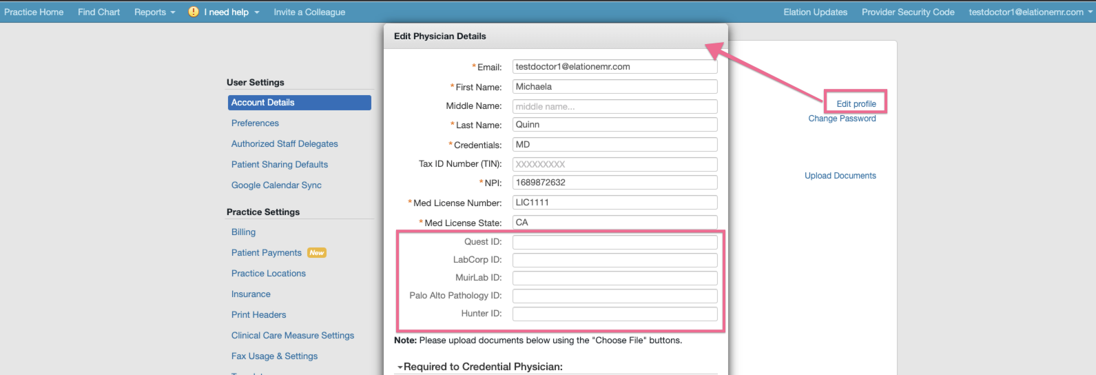 Lab Vendor Account information, when stored in Elation, will automatically display on electronic orders. Please note that the account information will only display on electronic order requisitions or when the information is stored in your physician details (Under Account Details >> Edit profile):