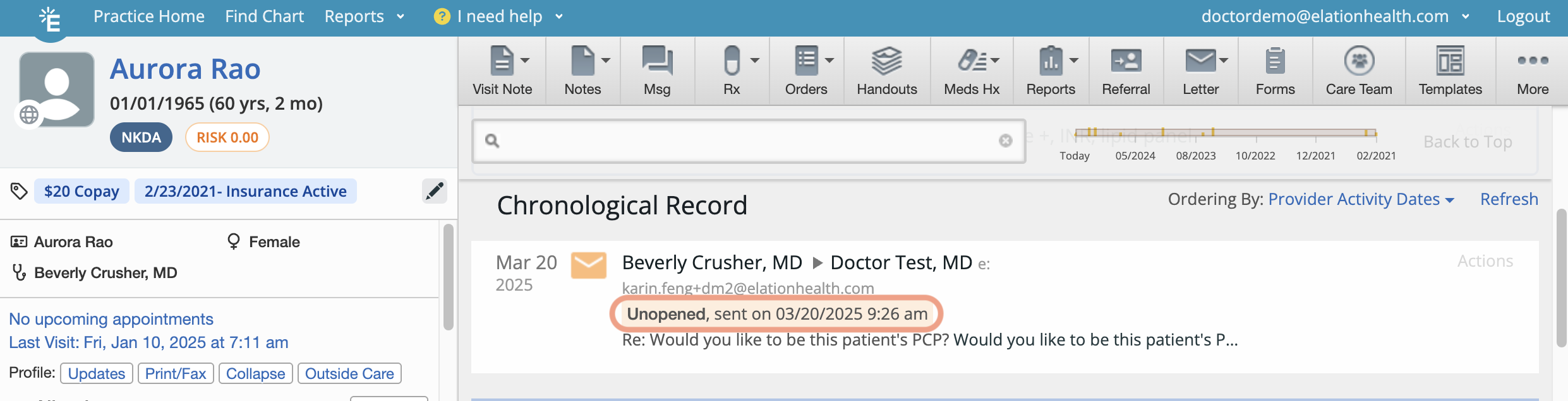 Check the Provider Letter or Referral in the Chronological Record to see if the recipient has viewed your correspondence. Statuses include:- Opened/Unopened
