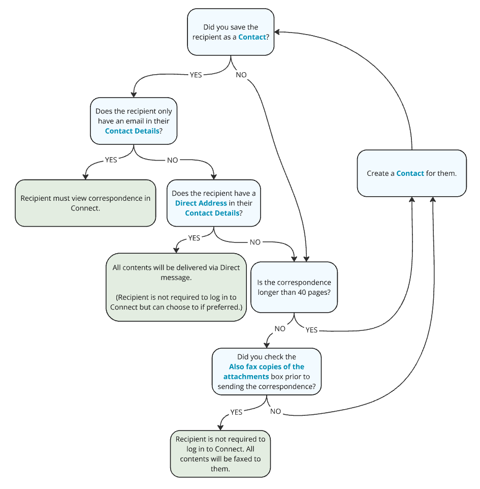 Recipients will receive a Connect invitation if they are saved as a Contact (and not an Elation EHR or existing Connect user) and chosen from the To field in your Provider Letter or Referral.| The selected recipient of the Provider Letter / Referral has a fax number listed in their Contact Details. | → | Recipient is notified of shared information via fax. | → | Recipient goes to www.elationemr.com/fax and enters the Reference Code from the fax. | → | Recipient registers for a Connect account. | → | Recipient views correspondence in Connect. |
